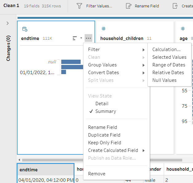 Under Clean 1 step, frequency distributions of each variables could be observed. To ensure that the eventual visualisation is limited to data collected in January 2021 only, the endtime was filtered by clicking on the 3 dots button “…” > Filter > Range of Dates