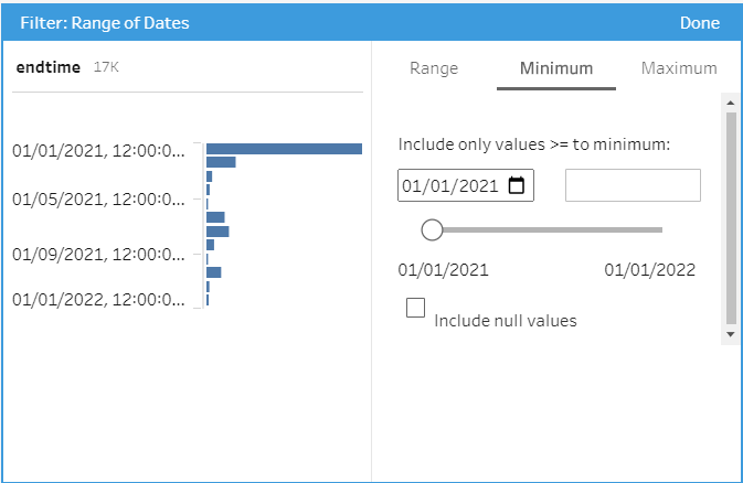 The minimum date was set at 01/01/2021. Since from the frequency distribution it was observed that there are no data collect beyond January 2021, a maximum date need not be inputted.