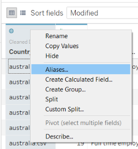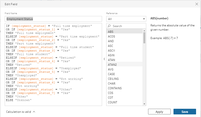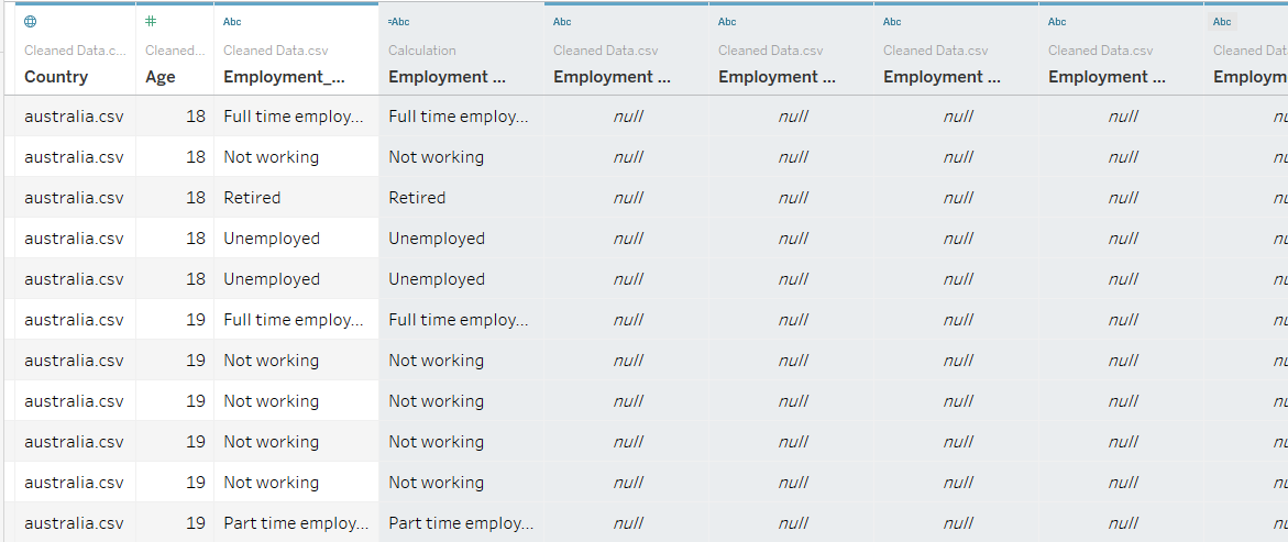 It was also observed that the datas sets from several countries have separate fields for respondents to respond to the question on their employment status, i.e. employment_status_1, employment_status_2, employment_status_3, employment_status_4, employment_status_5, employment_status_6, employment_status_7. A calculated field was created to harmonise these fields into one. After clicking on Create Calculated Field…, input the formula shown below to consolidate the different variables for employment status.