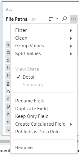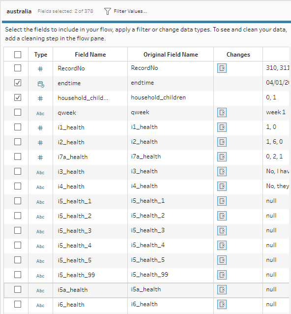 From the right panel, it was observed that the data has many variables. Referring to the codebook.xlsx file, identify the variables to be retained and leave them checked. One could either first uncheck all fields then manually check the fields needed, or leave all fields checked and manually uncheck the fields not needed. For this visualisation exercise, the fields selected are: endtime, household_children, age, gender, household_size, employment_status, vac_1, vac2_1, vac2_2, vac2_3, vac2_6, vac_3, employment_status_1, employment_status_2, employment_status_3, employment_status_4, employment_status_5, employment_status_6, employment_status_7, File Paths.