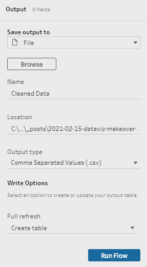 Finally, export the data by creating an Output step. Click on the the “+” button beside Clean 1 and select Output.
