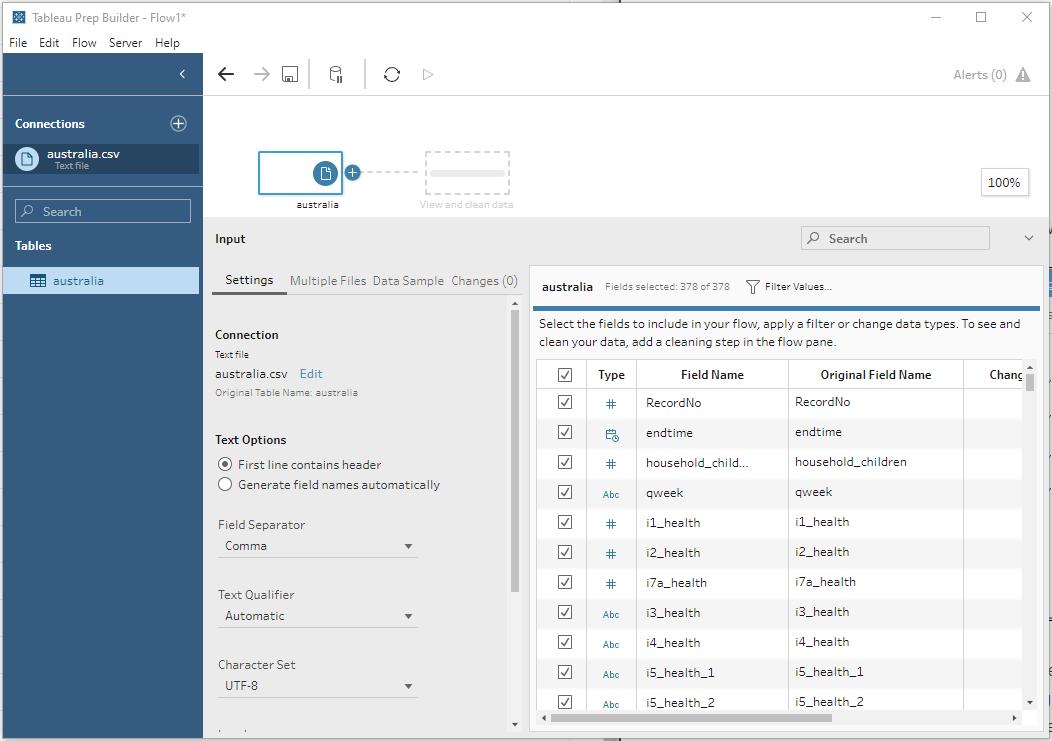 Using Tableau Prep Builder, the australia.csv file was first dragged directly from the folder into the Tableau Prep Builder window.