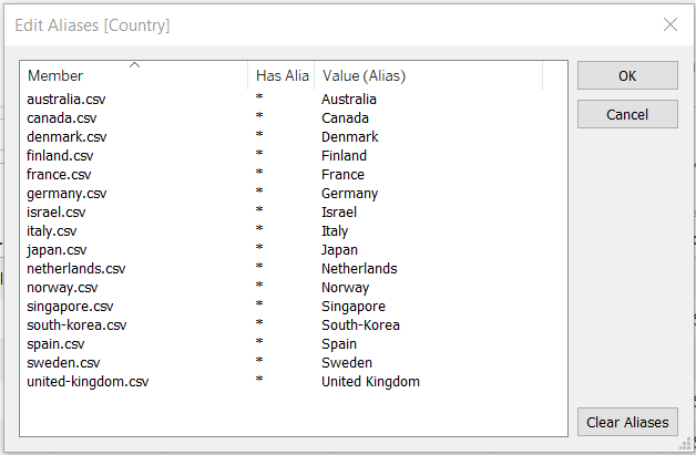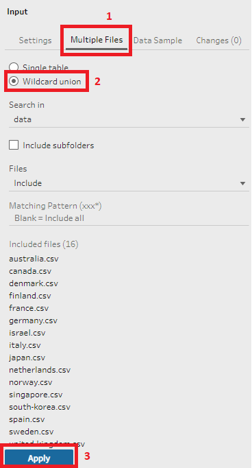 To merge the data files of the other countries, make sure that the files are save in the same location as australia.csv. Thereafter, in Tableau Prep Builder, select the Multiple Files tab > Wildcard union > Apply