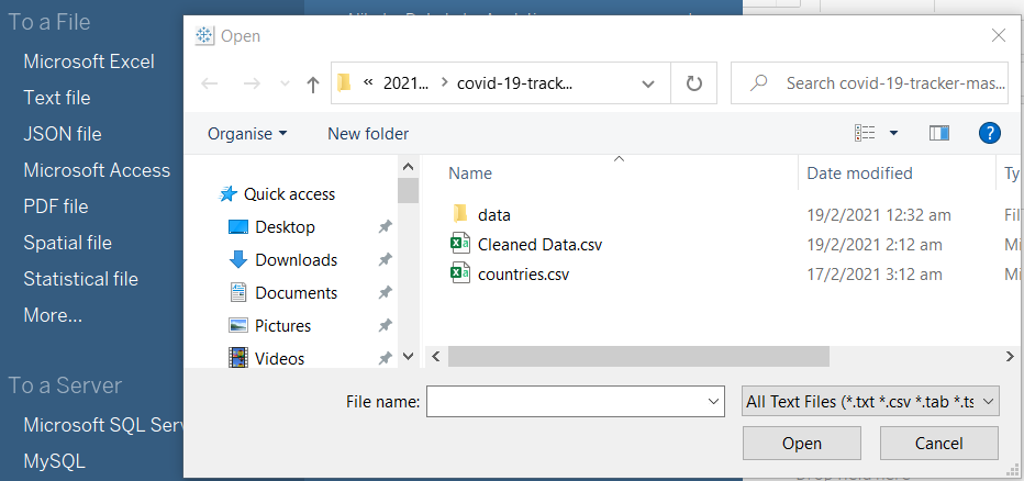 Open up Tableau, click on Text file and locate the Cleaned.csv file exported from Tableau Prep Builder