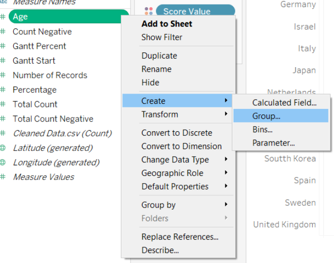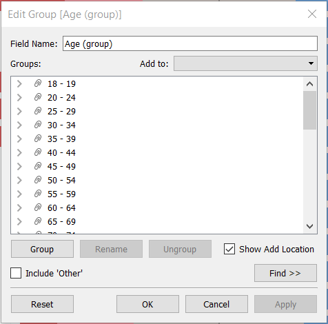Next, to create the typical age groups used, right-click on Age on the left panel. Then, select the first age then hold down Shift key to select the last age of the age group to be created. Click on Group and input the name of the age group.