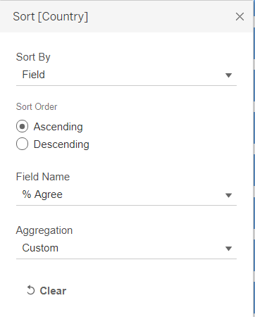 Lastly, on the dropdown of Country field in Rows, and select Sort. Sort By Field in Ascending order, and select % Agree under Field Name.