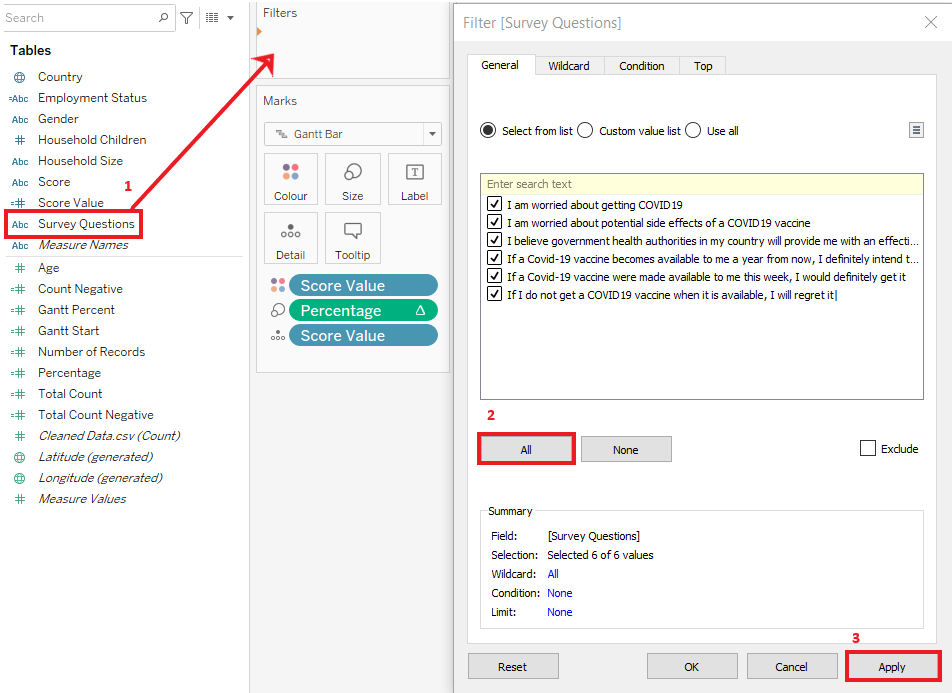 Drag Survey Questions into Filter, select All, and follow by Apply.