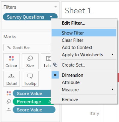 Right-click on Survey Questions under Filter, and select Show Filter.