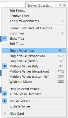 On the right panel, click on the the dropdown arrow in the Survey Questions filter and select Single Value (dropdown).