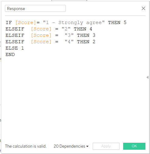Create a calculated field to assign an integer value to each score and name is “Response”.