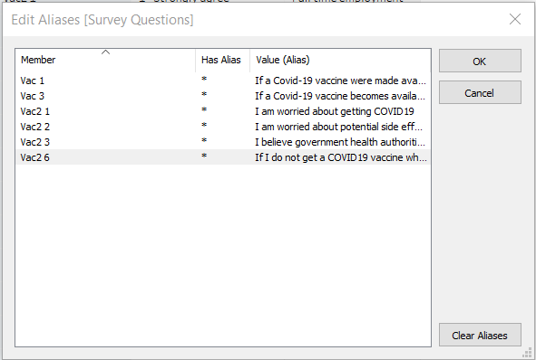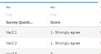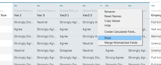 To create the diverging stacked bar chart, the vaccine related survey questions, i.e. vac_1, vac2_1, vac2_2, vac2_3, vac2_6, vac_3, are pivoted. Highlight the columns, right-click, and select Pivot.