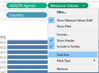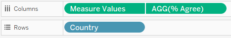 To create the chart, % Agree was first dragged into Columns from the left panel and Country into Rows