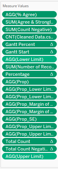 | Prop_SE | SQRT(([% Agree]*(1-[% Agree]))/SUM([Number of Records])) |