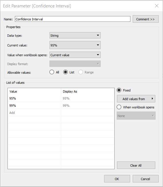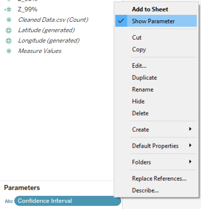 Right-click on the Confidence Interval parameter created and select show Parameter.