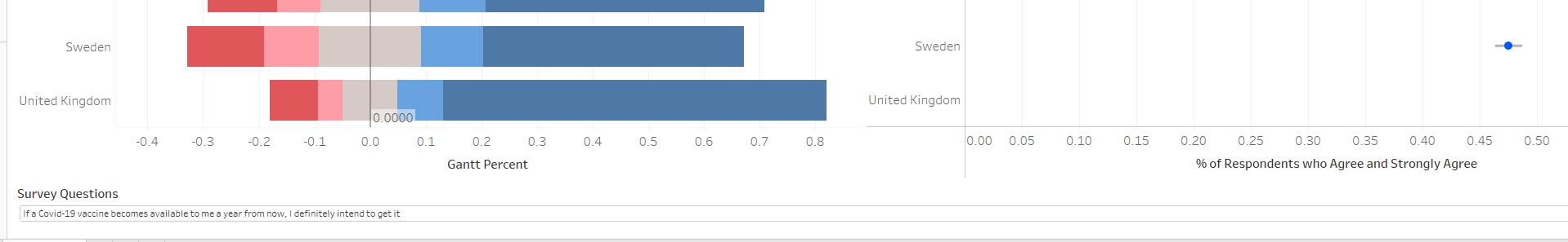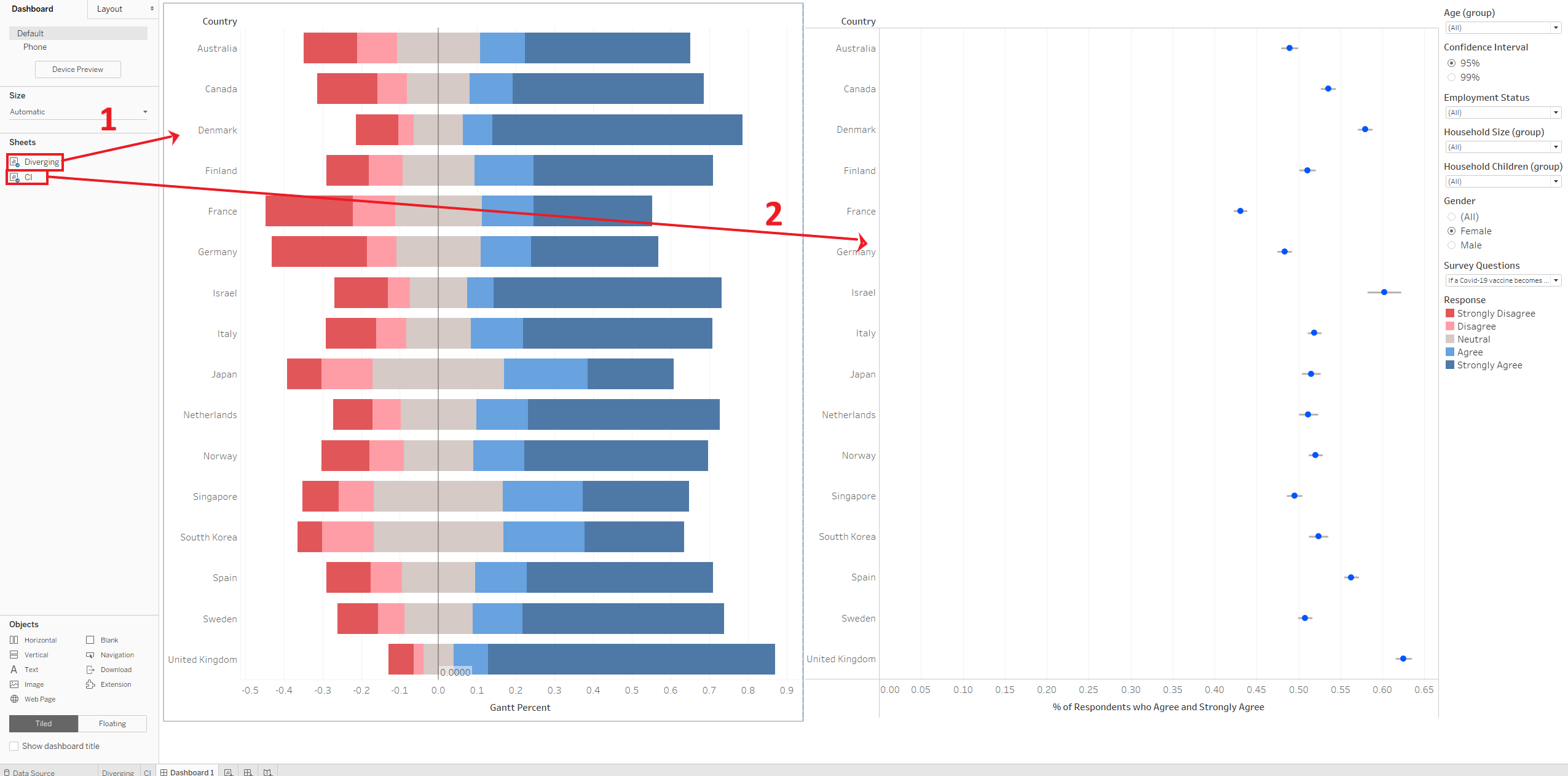 In a new dashboard, drag the “Diverging” worksheet into the center. Next, drag the “CI” worksheet onto the right side of the diverging stacked bar chart.