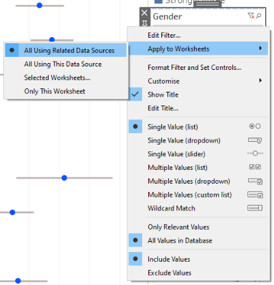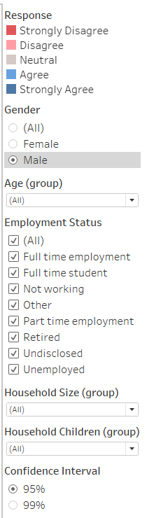 Finally, right-click on the Household Children (group), Household Size (group), Age (group), Employment Status, and Survey Questions filters > Apply to Worksheets > All Using Related Data Sources to synchronise the filters for both charts. This has to be done individually and manually for all filters mentioned.